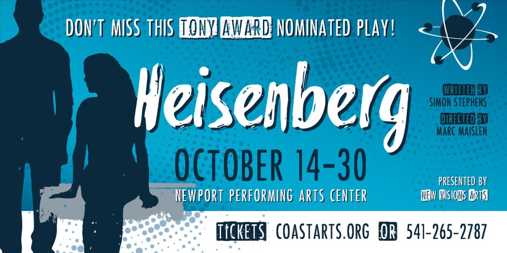 In New Visions Arts’s production of “Heisenberg” by Simon Stephens, performers Sherron Watson and Pete Theodore bring this funny, touching and altogether uncertain love story to life. A surprising relationship unfolds when a 75-year-old Irish butcher is kissed by a 45-year-old woman from New Jersey; two opposites that risk coming together in humor, individuality, and passion. Heisenberg reveals what happens when old ideas are tossed aside for truth and the life-giving force that two people experience when given the opportunity to become who they are.